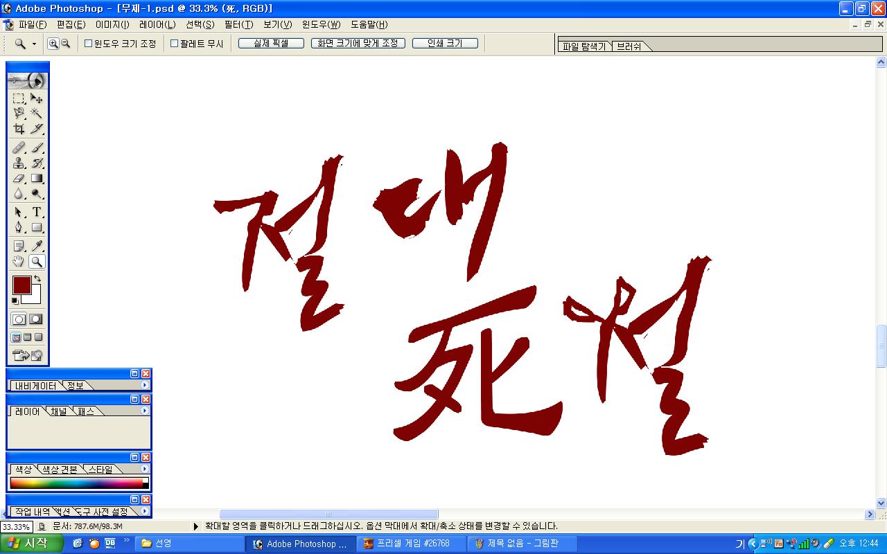 정중히 캘리 부탁드립니다. -_- 류재철 일반 0 5774 2009.11.16 11:18 실력자 분들이 많이 계셔서 이렇게 염치없게 부탁드립니다. - 절대死절 : 첨부한 파일 참고해주시면 감사하겠습니다.(약간 거친느낌? ^^;;) : '절'자의 ㅈ은 가위로...^^;; : 포스터 제작용이라 ai 파일이 필요합니다. 대학동아리 연극공연 포스터로 쓸 예정입니다. 비상업적인 공연이라 이렇게 부탁드립니다.